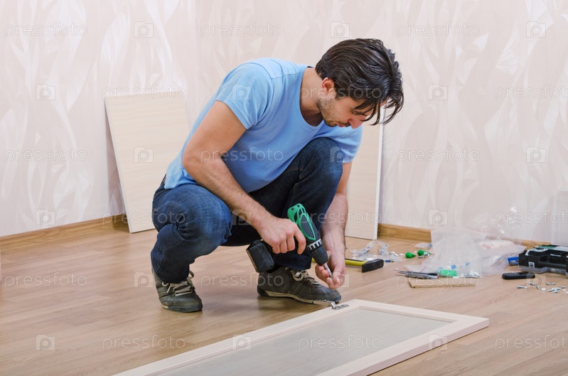 Мастер занимается сборкой мебели