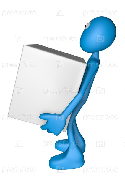 Синий человек несет коробку. 3D иллюстрация