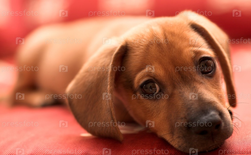 Щенок дакса лежал на красном диване