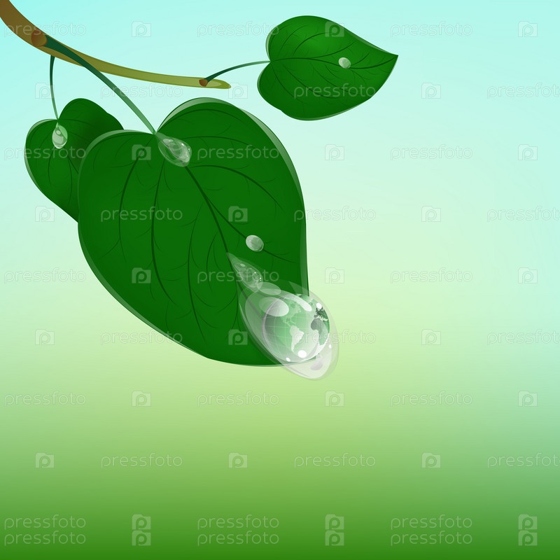 Зеленый глобус на листе дерева в каплях дождя на абстрактном фоне. Экология. Здоровая планета