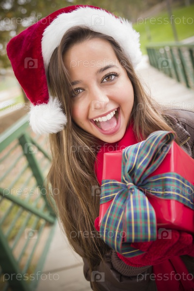 Красивая женщина в шапке Санта-Клауса с упакованным подарком