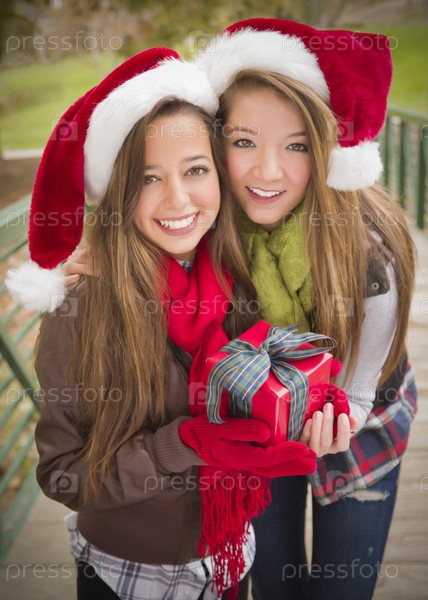 Две улыбающиеся женщины в шапках Санта-Клауса держат упакованные подарки