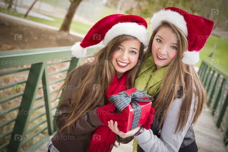 Две улыбающиеся женщины в шапках Санта-Клауса держат упакованные подарки