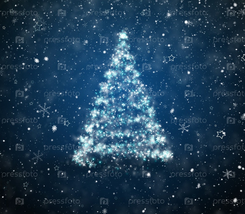 Рождественская елка с падающими снежинками и звездами на фоне