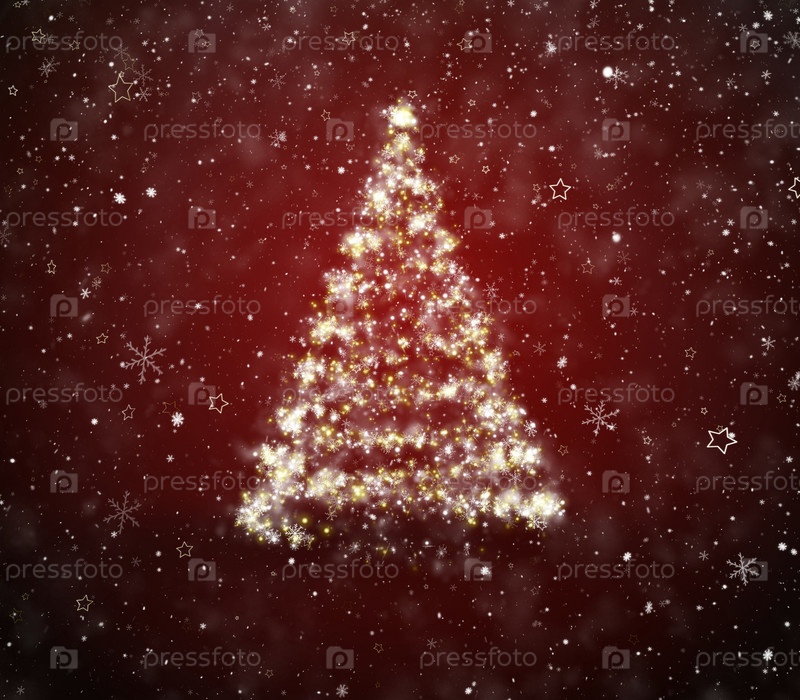 Рождественская елка с падающими снежинками и звездами на фоне
