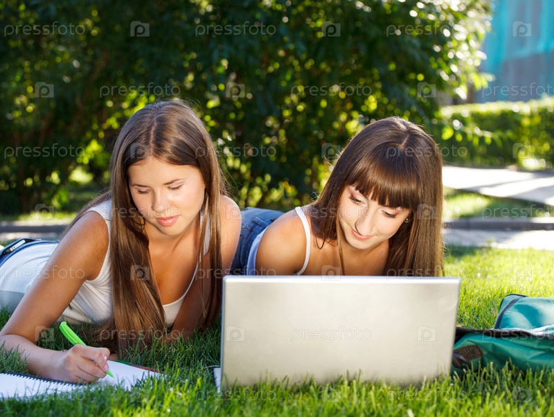 Счастливые молодые девушки с компьютером
