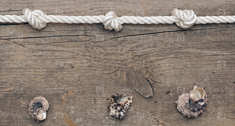 Веревка и морские ракушки на деревянном фоне