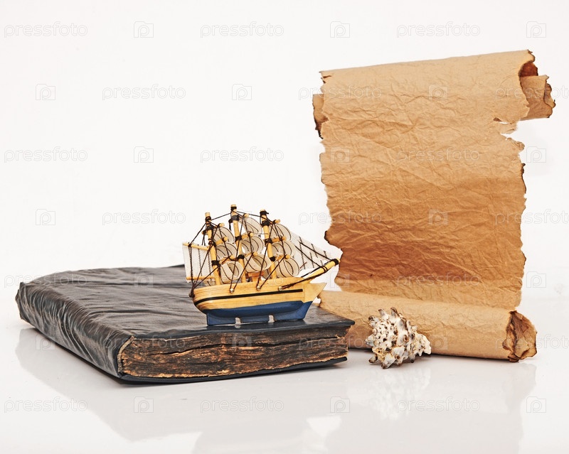 Антикварные книги с компасом и пустой свиток на белом фоне