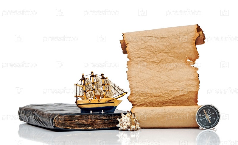 Антикварные книги с компасом и пустой свиток на белом фоне