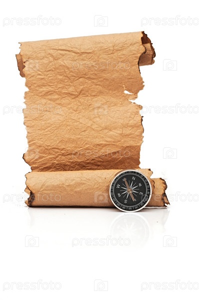 Бумажный свиток и компас на белом фоне