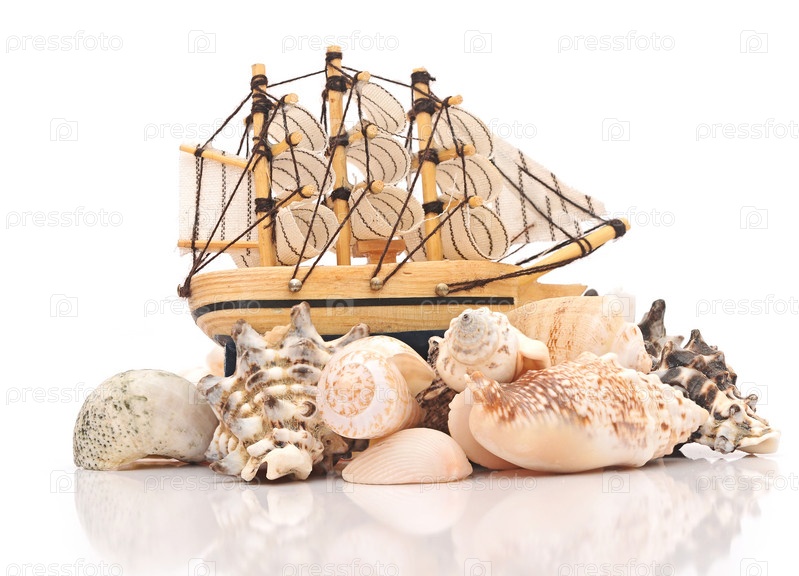 Парусник и морские раковины на белом фоне