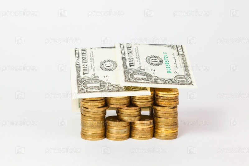 Дом из монет и банкнот, изолированный на белом фоне