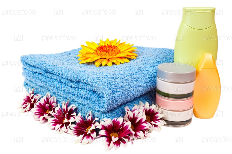 Синее полотенце, крем, герберы