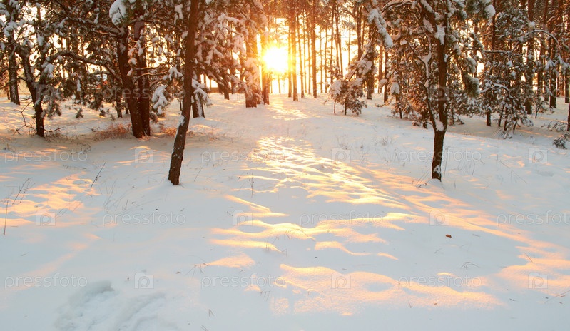Морозное утро в таинственном белоснежном сосновом лесу