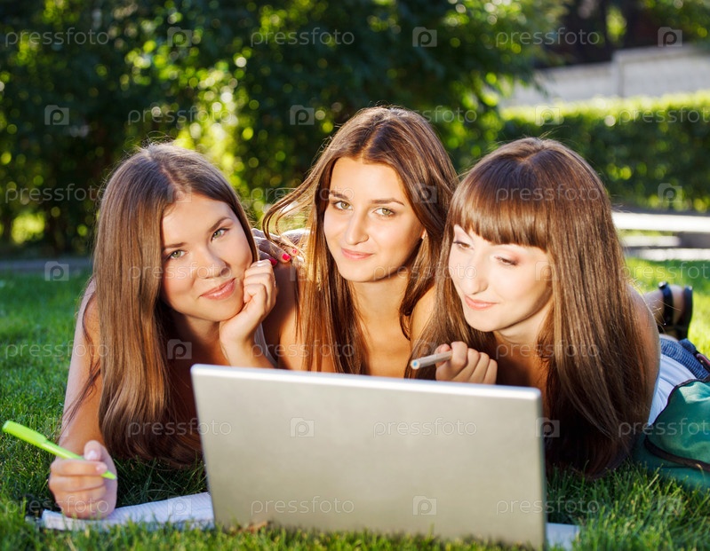 Счастливые молодые студентки с ноутбуком