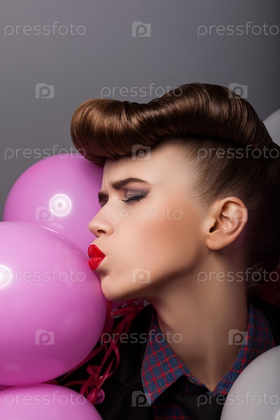 Эмоции. Забавная девушка с красочными воздушными шарами