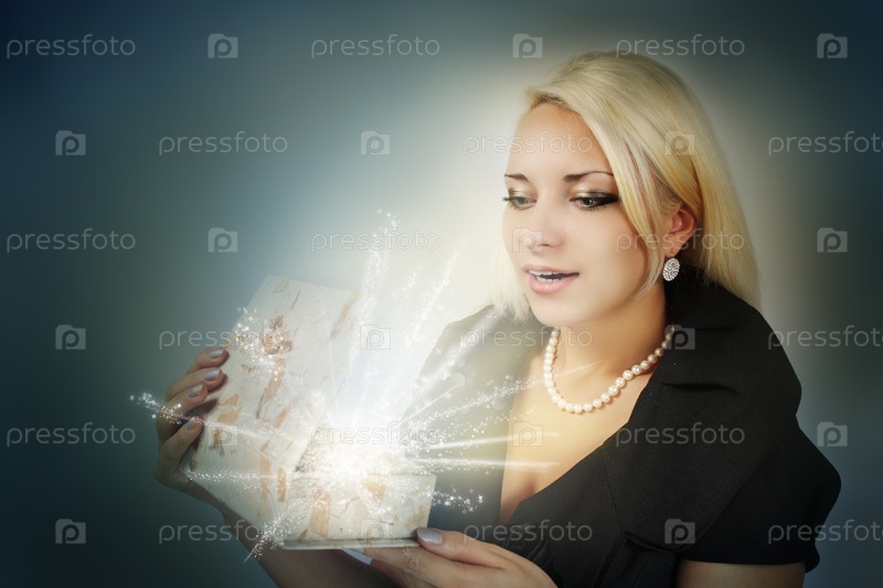 Женщина открывает подарок