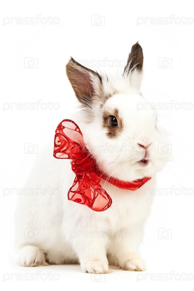 Симпатичный белый кролик с бантом на белом фоне