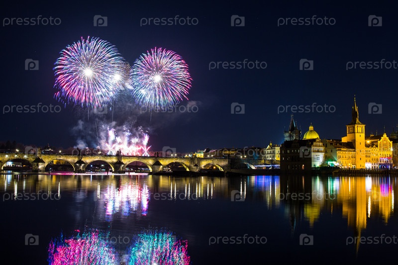 Красочный фейерверк над Карловым мостом, Праги. Чешская Республика