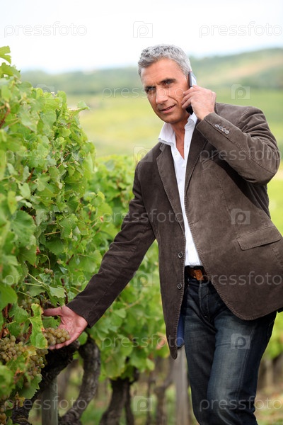Фермер с мобильным телефоном стоит в винограднике