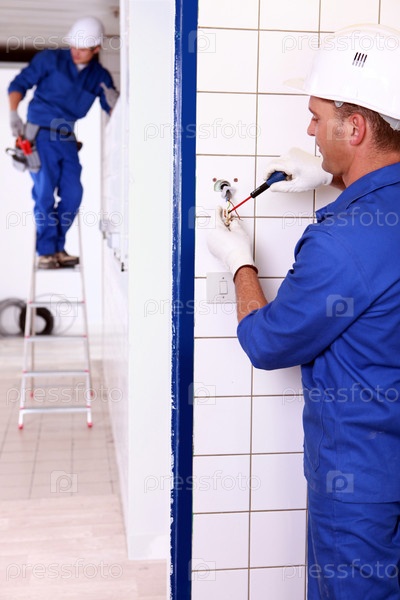 Электрик привинчивает электрическую розетку и коллега на стремянке