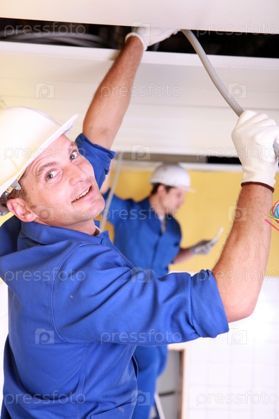 Дуэт электриков, работающих в помещении