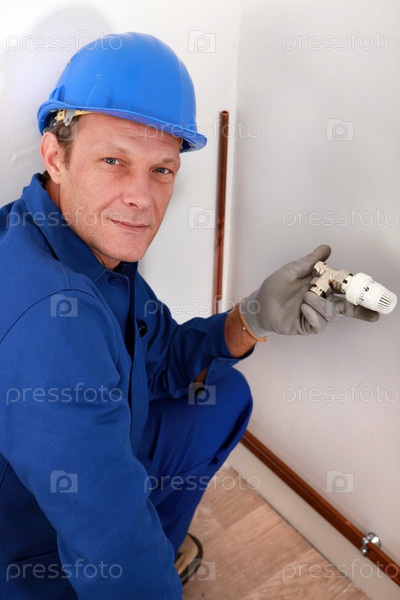 Рабочий держит регулятор температуры радиатора