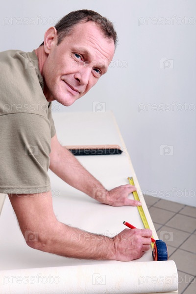 Работник измеряет обои