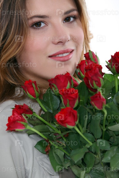 Молодая женщина с кучей красных роз