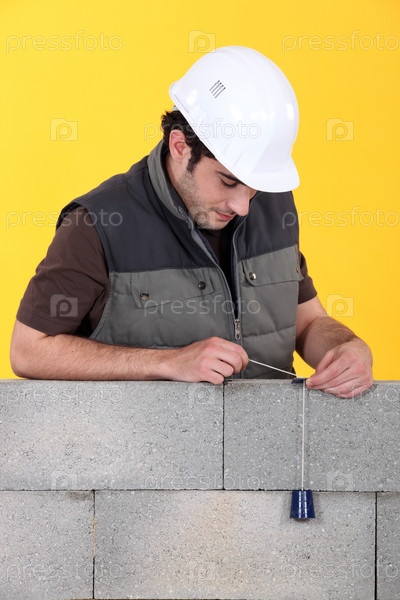 Рабочий использует отвес для проверки стены