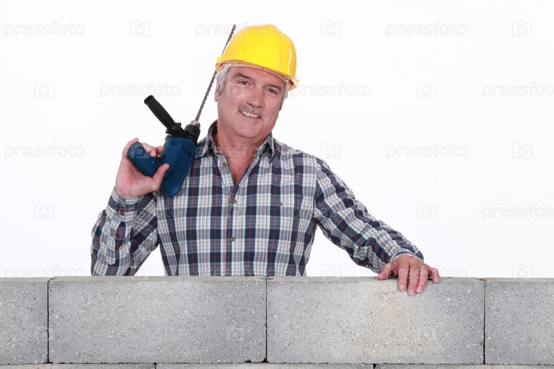 Строитель у стены с электродрелью
