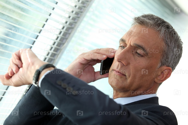 Бизнесмен смотрит на часы, говоря по телефону