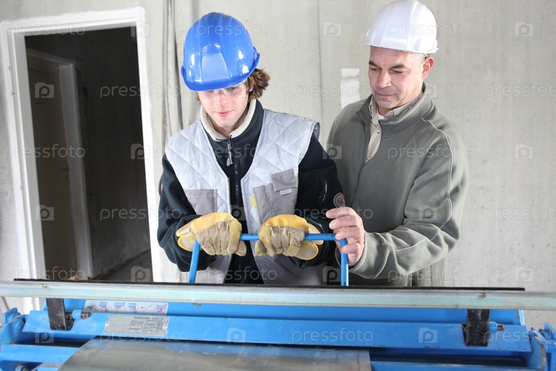 Двое мужчин используют механизм для резки листового металла