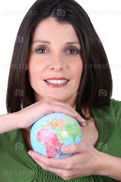Темноволосая улыбающаяся женщина, держащая глобус в обеих руках