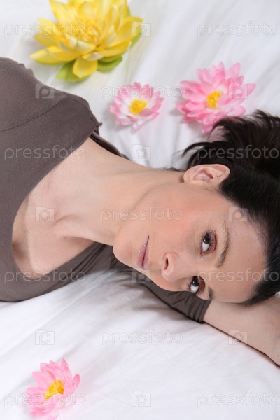 Молодая женщина лежит на кровати с цветами
