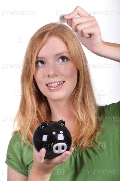Молодая женщина с копилкой