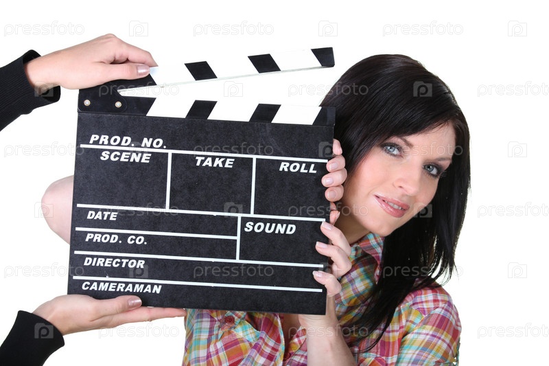 Брюнетка держит хлопушку для киносъемок