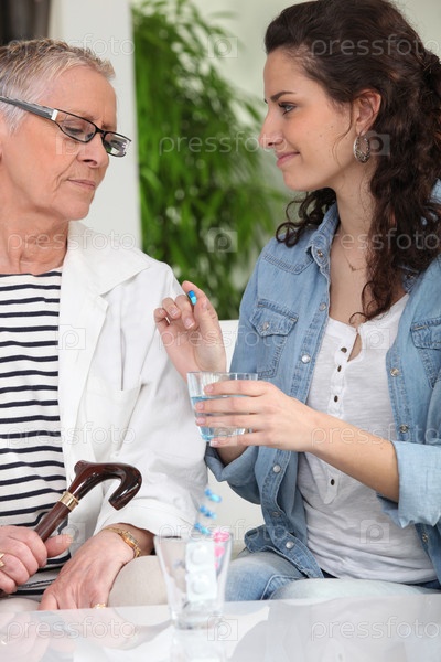 Женщина дает таблетки пожилой женщине