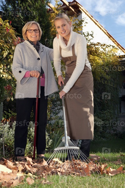 Молодая женщина помогает пожилой женщине в саду
