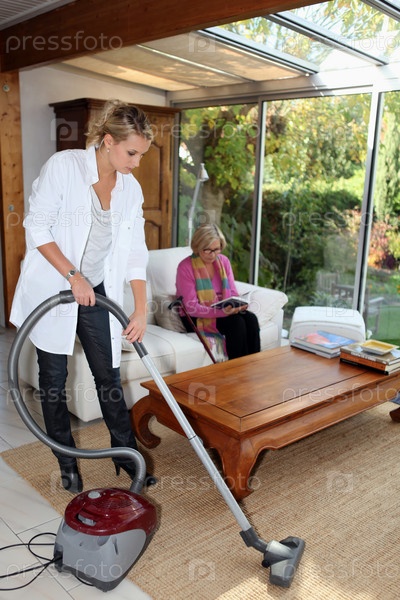 Девушка пылесосит для пожилой женщины