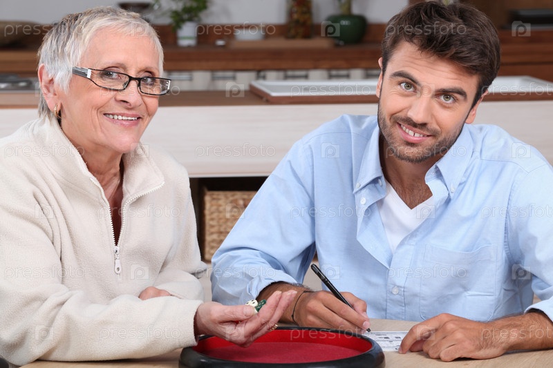 Молодой человек играет в кости с пожилой женщиной