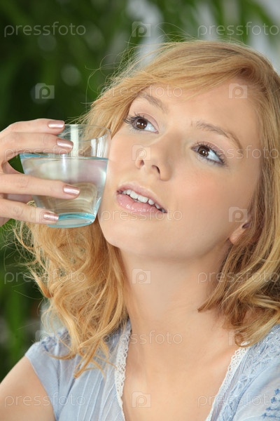 Молодая блондинка со стаканом воды у щеки