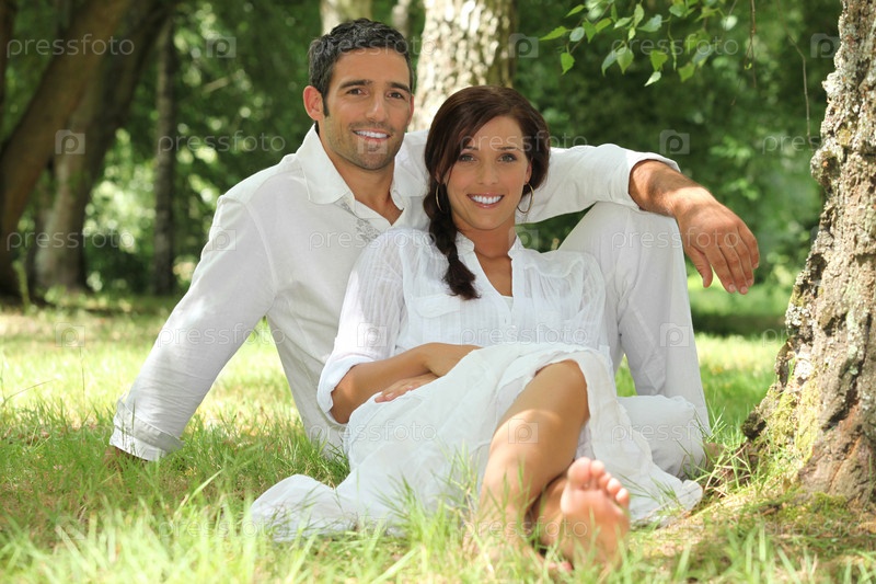 Пара в белом сидит на траве