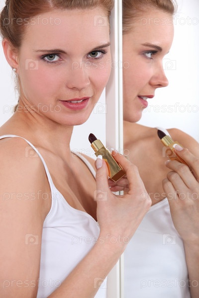 Женщина наносит помаду перед зеркалом