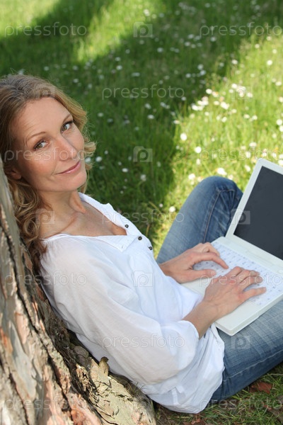 Женщина пользуется интернетом в общественном парке