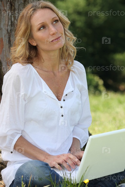 Задумчивая женщина печатает на ноутбуке в саду