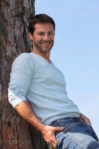 Мужчина стоит, опираясь на дерево