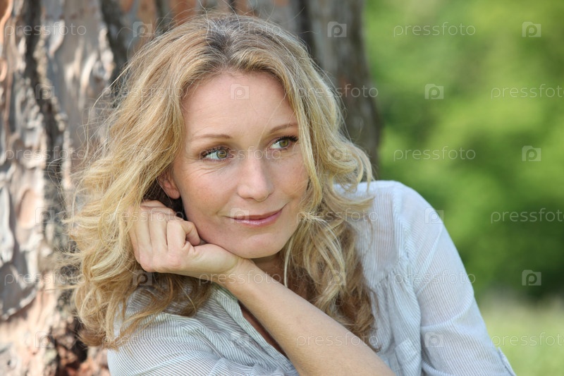 Улыбающаяся женщина сидит у дерева
