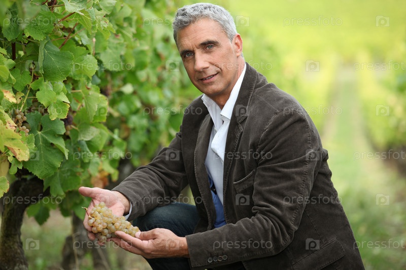 Владелец виноградника осматривает гроздь винограда