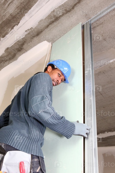Молодой плотник устанавливает двери в помещении